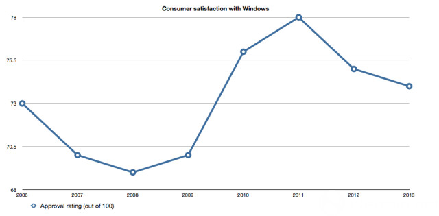 Jika membandingkannya dengan Windows Vista yang beberapa tahun yang lalu dirilis, dengan penjualan yang menurun jika dibandingkan dengan Windows 7, ternyata Windows 8 lebih rendah lagi dibandingkan dengan Vista. Hal ini datang bukan tanpa alasan, dapat dilihat dari sebuah survei yang dilakukan ASCI dengan merilis sebuah grafik tentang kepuasan konsumen. Dari grafik yang diberikan tersebut, titik terendah ternyata bukan datang dari Windows Vista, melainkan Windows 8.